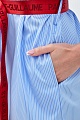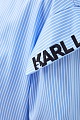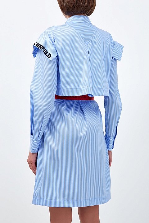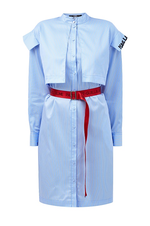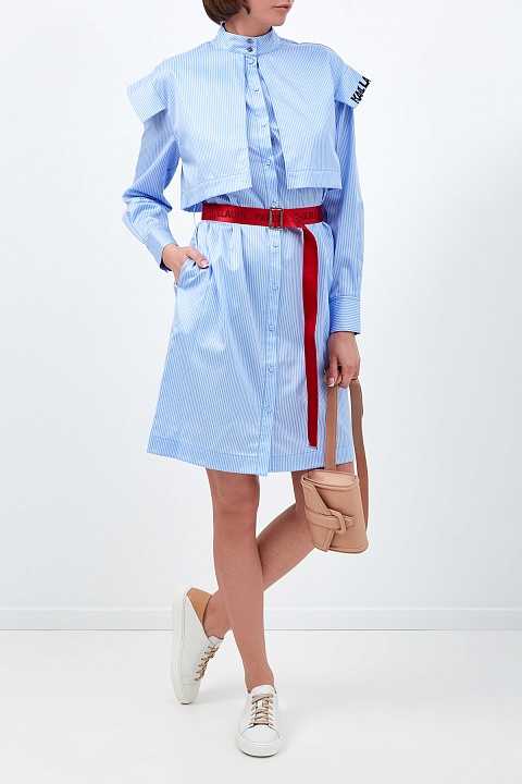 Платье-рубашка с принтом в полоску — культовый элемент коллекций Karl Lagerfeld. Для создания модели был выбран плотный хлопковый поплин в классической бело-голубой гамме. Строгий стиль изделия нивелирует oversize-отделка в виде кейпа с вышитым логотипом бренда и контрастный пояс с жаккардовым принтом Rue St-Guillaume. Детали: застежка на пуговицы, отложной воротник, рукава на манжетах.