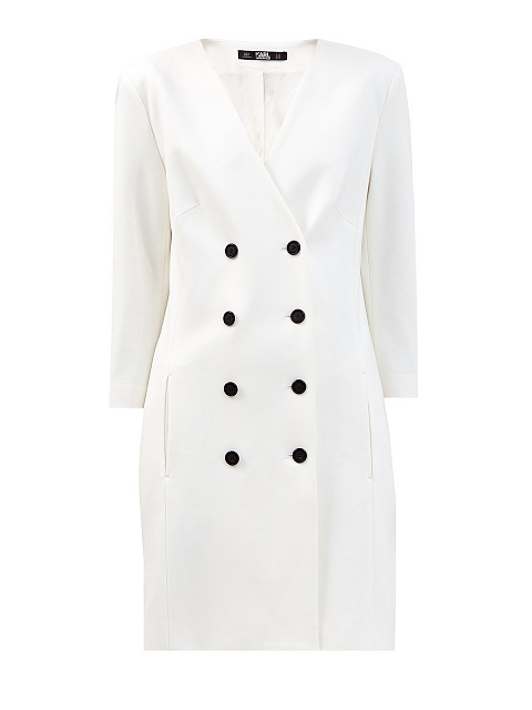 Двубортное монохромное платье-блейзер от Karl Lagerfeld сочетает изысканный стиль и современное исполнение. Классическая модель из ткани пунто с эластичной подкладкой идеально подходит для элегантных повседневных, деловых и вечерних образов. Детали: V-образный вырез, рукава ¾, прорезные карманы.