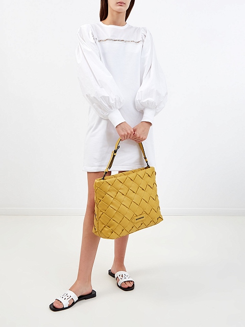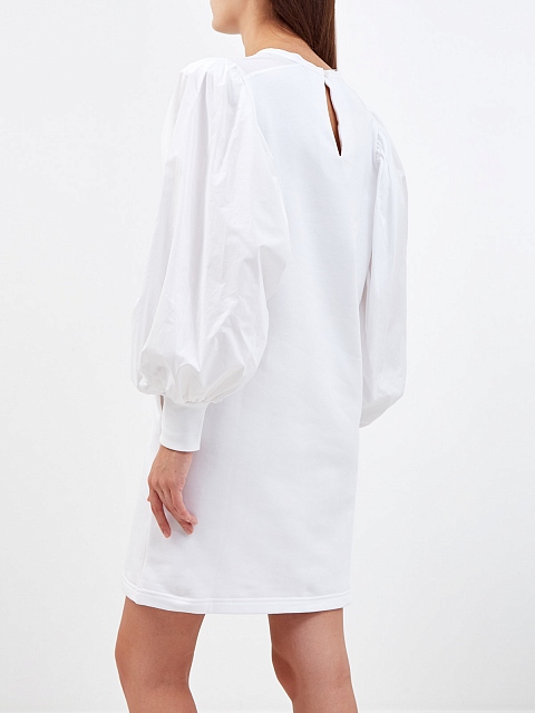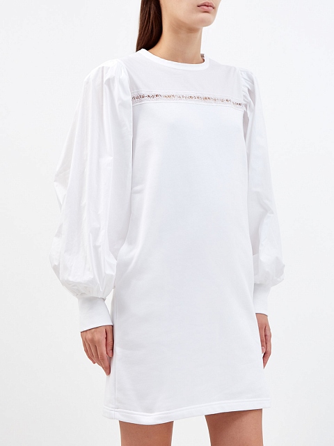 Белое платье-толстовка в стиле спортшик от Karl Lagerfeld выполнено из комбинированного хлопка. Свободный крой и потайные карманы обеспечивают максимальный комфорт в движении. Модель дополнена незаменимой отделкой в стиле KARL — глянцевой тесьмой с логотипом в тон, а также объемными рукавами.