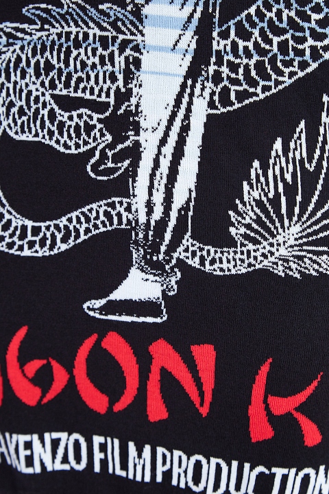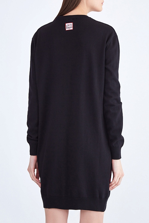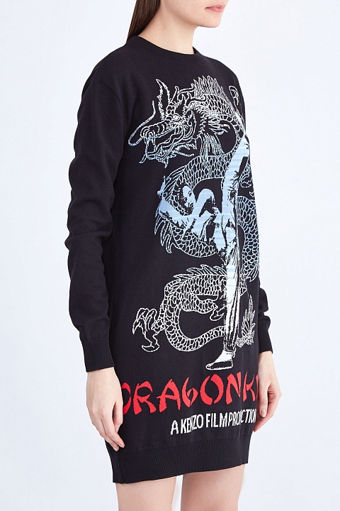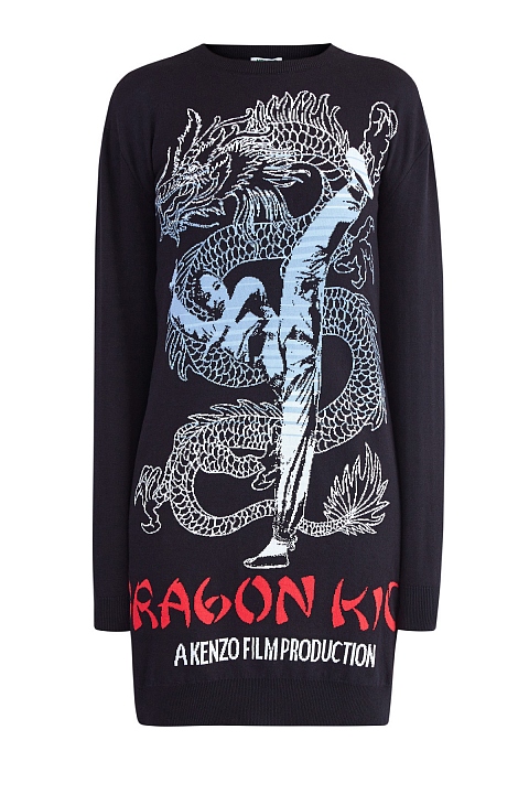 Стильное платье-джемпер от Kenzo создано из гладкой пряжи из хлопка и шерсти в черном цвете. Передняя планка декорирована жаккардовой вышивкой «Dragon Kick», вдохновленной азиатскими киноафишами, а спинка дополнена нашивкой с символикой «Color by Kenzo». Детали: эластичные кромки, круглая пройма горловины, свободный крой.