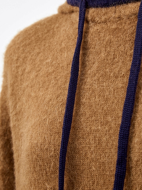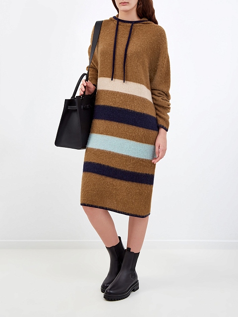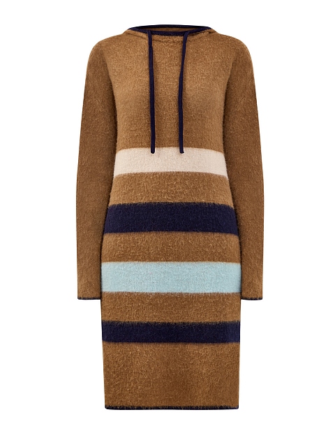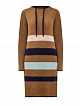 Шерстяное платье в спортивном стиле от Lanvin. Полностью натуральная пряжа с характерной объемной фактурой идеально подходит для создания теплых образов и легко сочетается с объемной обувью и верхней одеждой. Оттенок camel дополнен цветовыми акцентами в фирменном стиле Модного дома. Капюшон на контрастной кулиске и расслабленный силуэт делают аутфит максимально комфортным. Сделано в Италии.