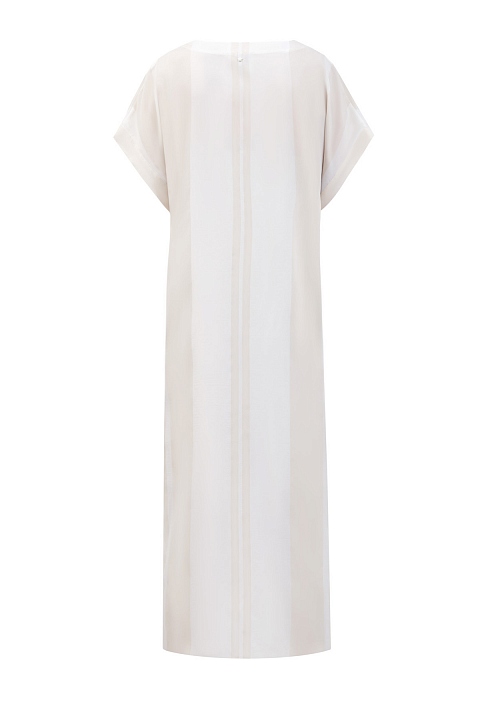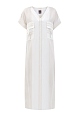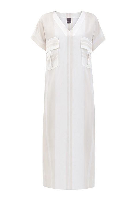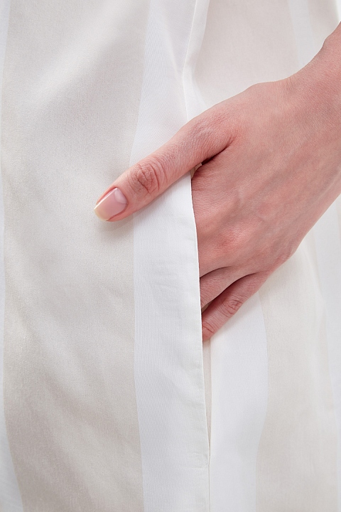 Платье-рубашка кроя oversize от Lorena Antoniazzi выполнено из экологически чистой вискозы. Нити шелка в составе придают материалу характерную струящуюся фактуру. Принт в широкую полоску и цельнокроеные рукава с отворотами создают образ в расслабленном стиле. Детали: V-образный вырез декольте, съемная комбинация внутри, два кармана по бокам и два объемных накладных кармана. Сделано в Италии.