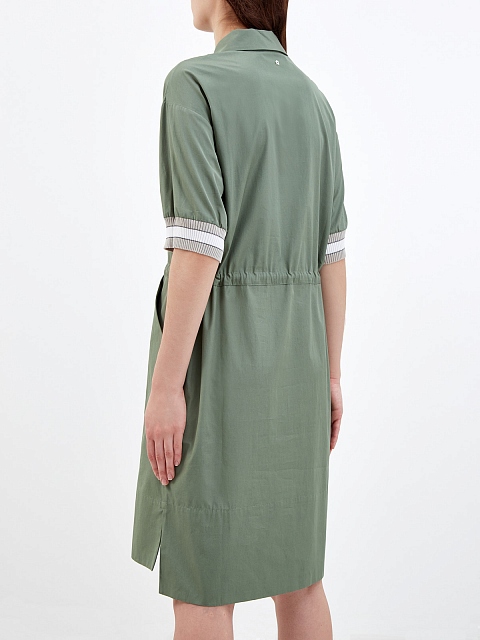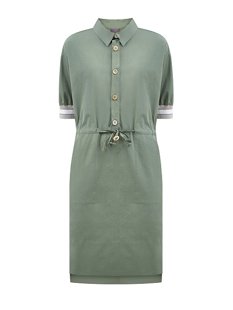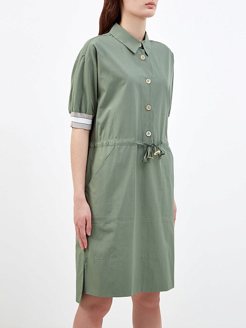 Платье в стиле поло от Lorena Antoniazzi представлено с мягком оттенке хаки. Модель выполнена из плотного хлопка и дополнена вязаной отделкой манжет, которая вносит в образ фактурный акцент. Кулиска на талии позволяет создать приталенный силуэт, а разрезы в боковых швах и спущенная линия плеч придают образу расслабленное настроение. Детали: застежка на пуговицы, два кармана. Сделано в Италии.