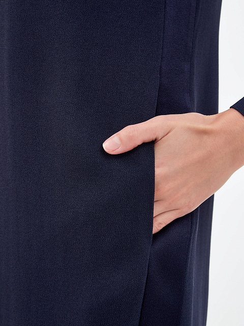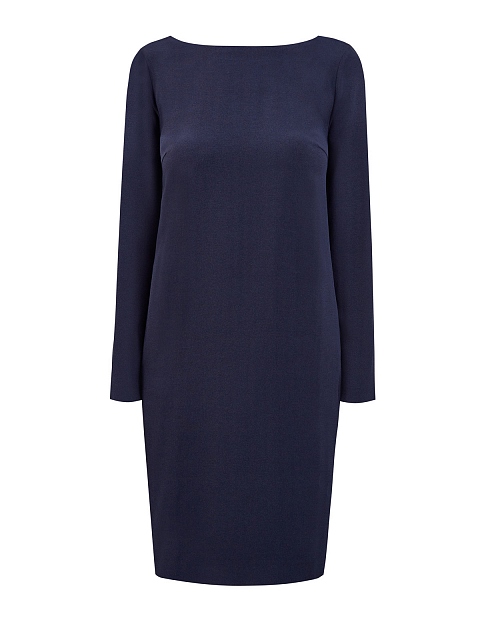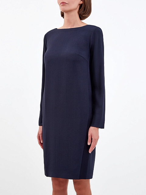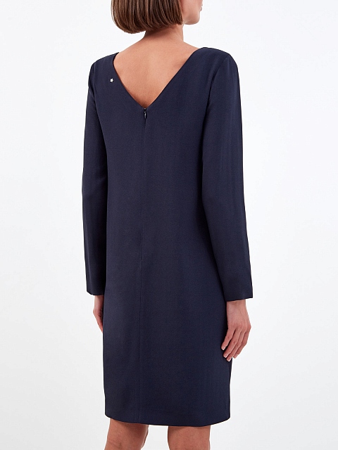 Минималистичное платье от Lorena Antoniazzi выполнено из легкой и струящейся ткани кади. Модель в благородном темно-синем оттенке дополнена декольтированной спинкой и длинными рукавами. Функциональный элемент — прорезные карманы по бокам. Детали: символика бренда из перламутра на спинке, вытачки для посадки точно по фигуре. Сделано в Италии.