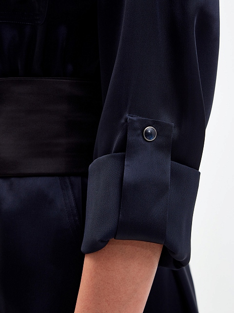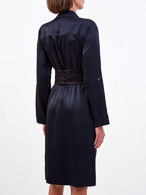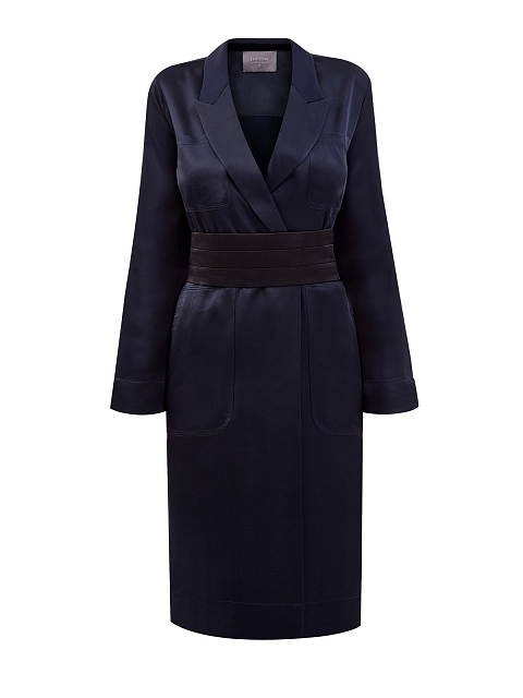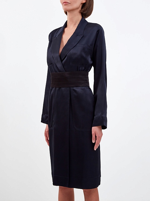Элегантное платье-блейзер от Lorena Antoniazzi создано из глянцевого атласа с благородным жемчужным переливом по поверхности. Декольте дополнено лацканами, которые придают образу строгость. Длинные рукава можно по желанию подвернуть и зафиксировать кнопками с инкрустацией. Детали: четыре кармана, широкий пояс, крой на запах. Сделано в Италии.