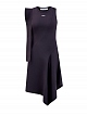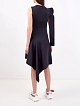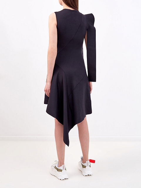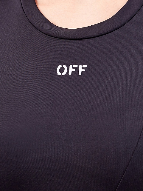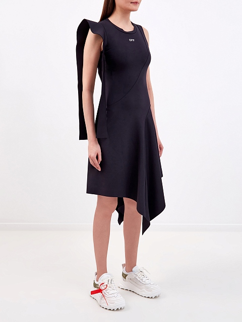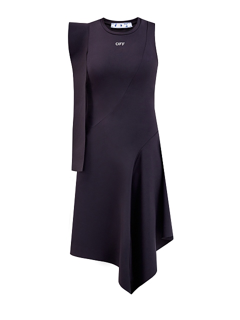 Эффектное платье без рукавов от Off-White создано из плотной эластичной ткани в черном цвете. Модель с асимметричным подолом и оригинальной вставкой-лентой станет идеальной основой для динамичных спортивных образов. Фирменный штрих — контрастный логотип бренда на передней планке.