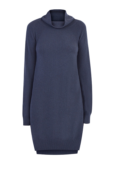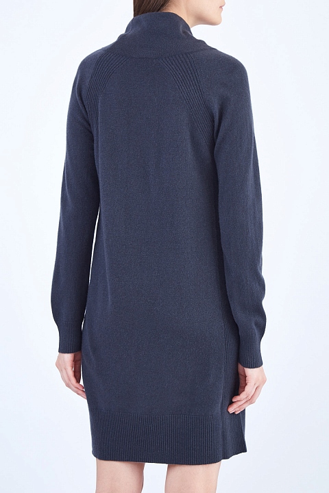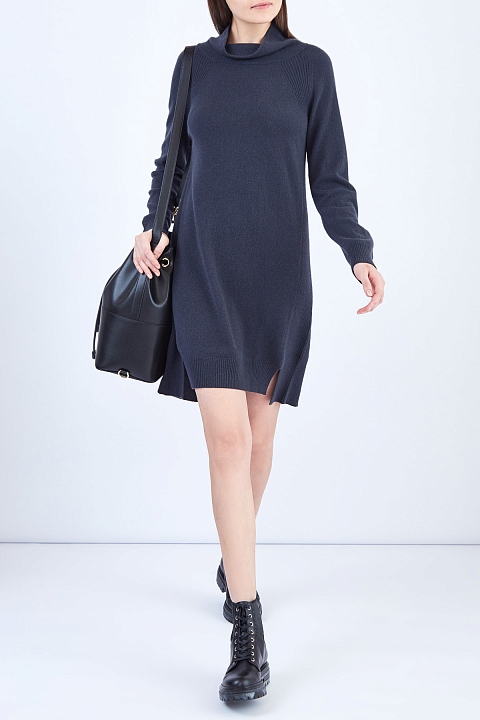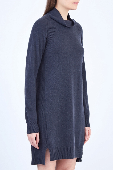 Лаконичное платье свободного кроя «баллон» от Panicale полностью выполнено из ценной кашемировой пряжи приглушенного серо-синего оттенка. Динамичный образ создают вставки фактурной вязки в рубчик, а также декоративные разрезы по асимметричной нижней кромке. Изделие с рукавами реглан дополнено высоким воротом-стойкой. Сделано в Италии.