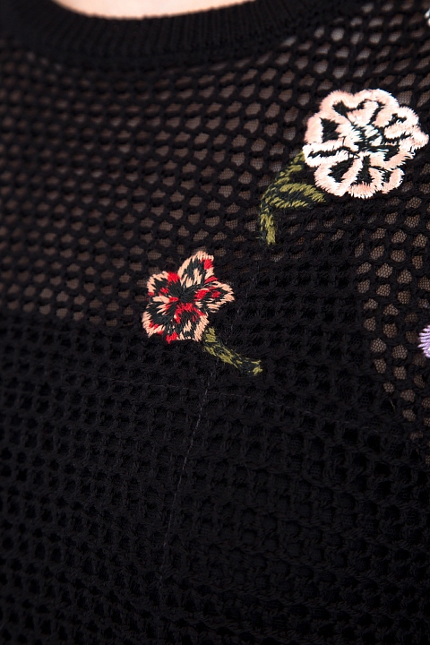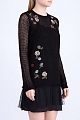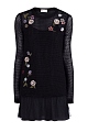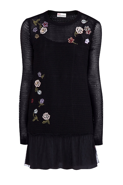 Эффектное двухслойное мини-платье REDValentino, отличительной особенностью которого стало сочетание тончайшей шерсти и полупрозрачного кружева, украшающего юбку. Модель свободного силуэта украшена цветочной вышивкой контрастного оттенка.