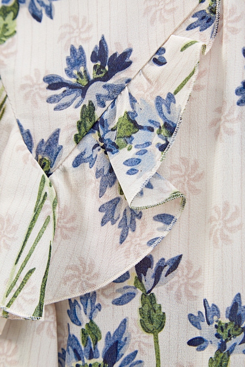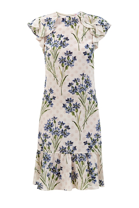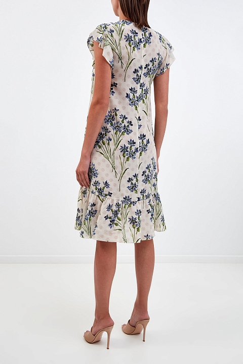 Шелковое платье-миди с фактурными рукавами и коллекционным принтом «Василек»