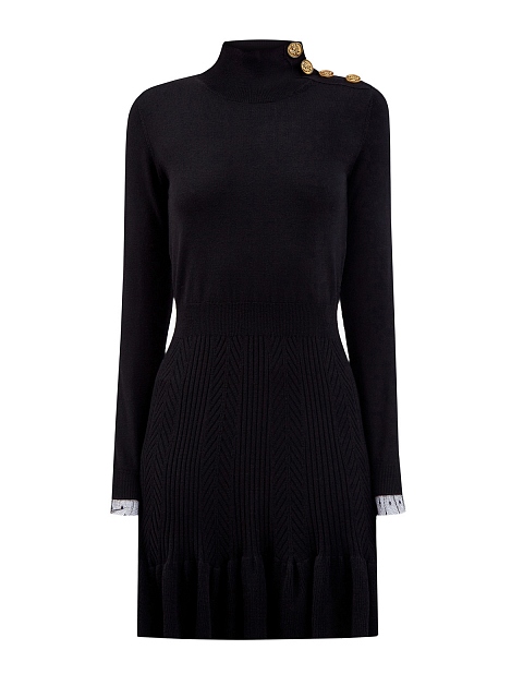 Элегантное платье приталенного кроя в классическом черном цвете от REDValentino. Модель из эластичного шерстяного трикотажа станет идеальной основой для создания женственных повседневных образов. Изысканный акцент изделию придает отделка манжет из тюля «пуэн-деспри». Застежка на крупные брендированные пуговицы с золотистым напылением на плечевой планке вносит неформальный штрих.