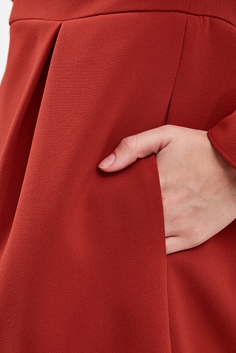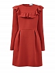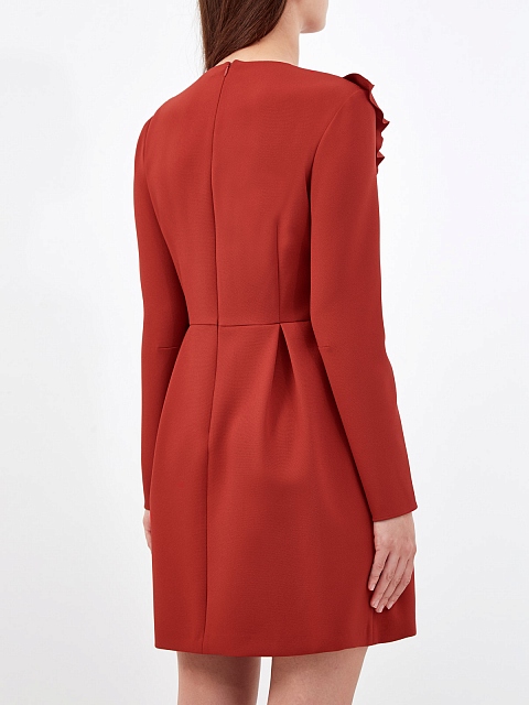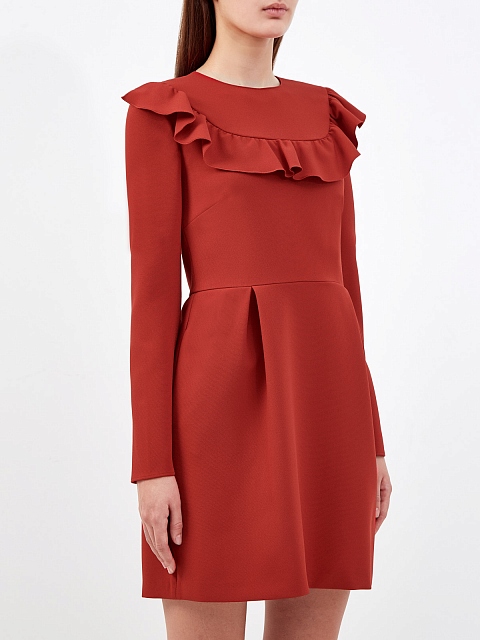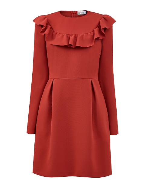 Эффектное платье A-силуэта от REDValentino создано из двойного крепа — эластичный материал повторяет движения тела и идеально подходит для составления повседневных образов. Модель в оттенке «красная помада» дополнена объемной оборкой, подчеркивающей женственный стиль изделия. Легкие заложенные складки от линии талии завершают дизайн. Детали: длинные рукава, застежка на потайную молнию на спинке.