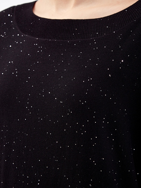 Платье-джемпер от Re Vera создано в универсальном черном цвете из хлопковой пряжи с добавлением эластичных волокон. Тонкий материал и свободный силуэт подчеркивают расслабленные линия кроя. Вплетенные миниатюрные пайетки с серебристым мерцанием придают изделию изящный акцент.