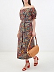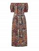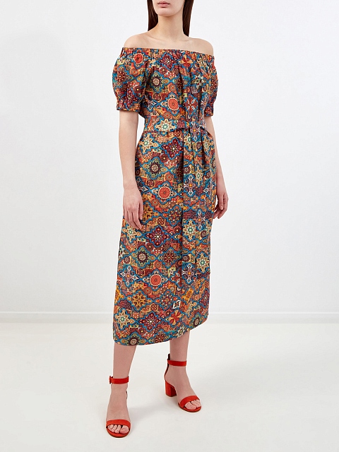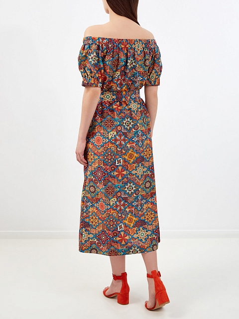 Яркое платье в этническом стиле с открытыми плечами и поясом