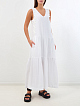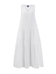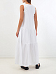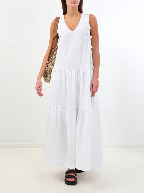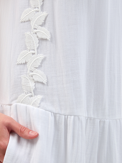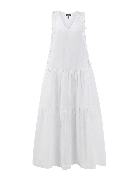 Однотонное платье расслабленного кроя от Re Vera выполнено из дышащей хлопковой ткани — тонкая ткань со струящейся фактурой подчеркивает свободный удлиненный силуэт. Модель в белом цвете дополнена ажурной флористической вышивкой в тон. Детали: прорезные карманы, многоярусный подол, V-образный вырез горловины, изделие без рукавов.