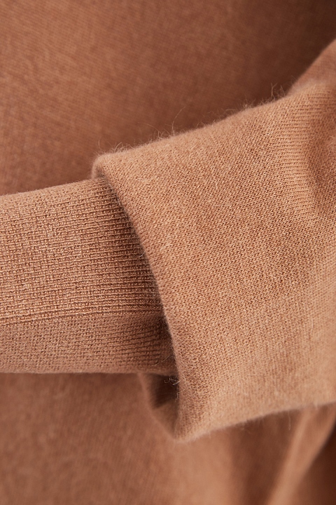 Лаконичное платье-миди от Stella McCartney создано в оттенке «тростниковый сахар» из теплой шерстяной пряжи с добавлением нити альпаки. Модель расслабленного кроя со спущенной линией плеч оснащена широкими кромками эластичной вязки в фактурный рубчик для придания силуэту объема в спортивном стиле. Элегантные акценты расставляет V-образная пройма горловины и декольтированная спинка.