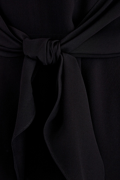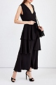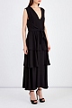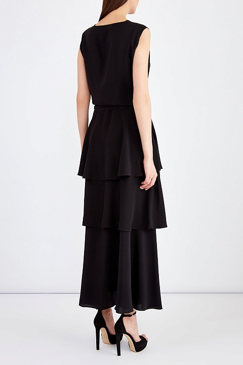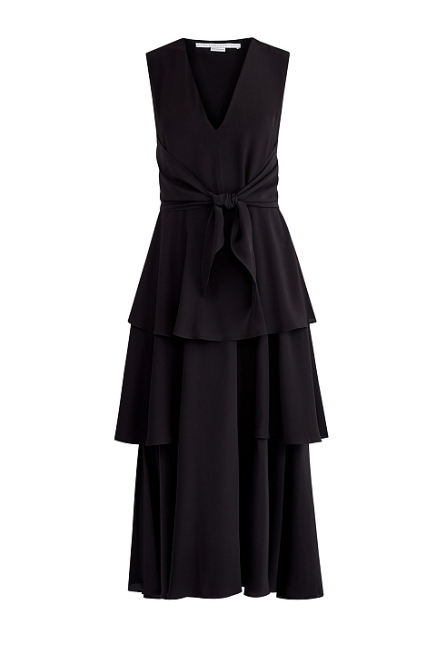 Минималистичное струящееся платье свободного кроя от Stella McCartney выполнено из воздушного шелка элегантного черного цвета. Широкие ленты на поясе формируют гармоничный приталенный силуэт. Изделие с глубоким V-образным вырезом декольте дополнено многослойным ниспадающим подолом с оборками. Детали: широкие бретели, потайная застежка-молния.