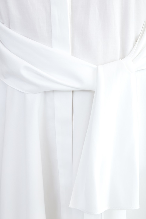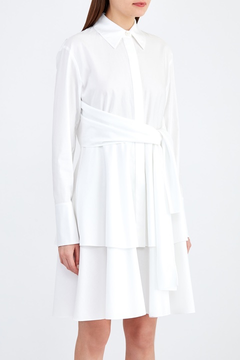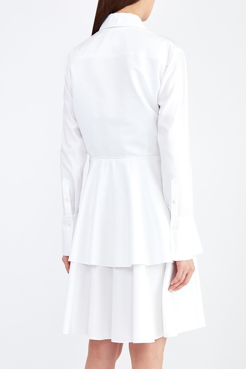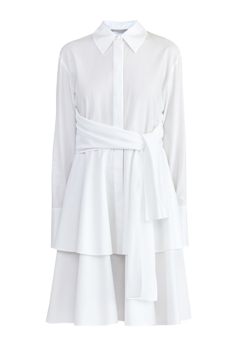 Стильное платье-рубашка длины мини от Stella McCartney создано из плотного, держащего форму органического хлопка белоснежного цвета. Классический силуэт с воротом-стойкой и манжетами на рукавах дополнен многослойным подолом с объемными за счет текстуры ткани оборками. Детали: спущенная линия плеч, пояс-ленты, вытачки для посадки по фигуре, потайная застежка на пуговицы.