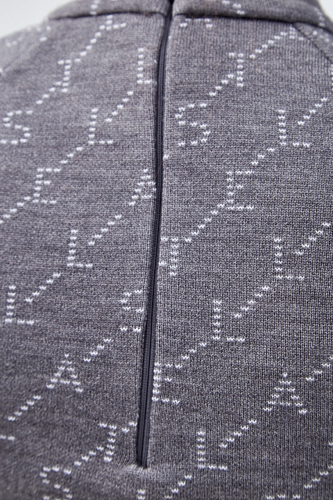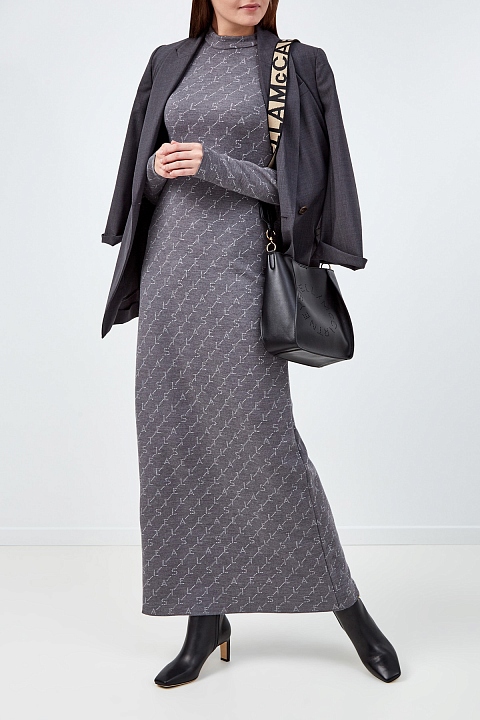 Лаконичное платье от Stella McCartney выполнено из плотной шерстяной пряжи в монохромной серо-белой гамме. Техника двойного плетения образует жаккардовый all-over принт в виде монограммы. Мягкий материал надежно защищает от низких температур благодаря свойствам натуральных волокон. Детали: ворот-стойка, слегка расклешенный подол, застежка на потайную молнию.