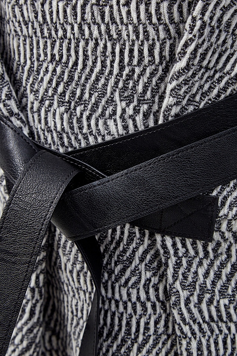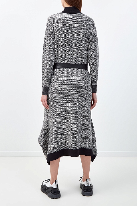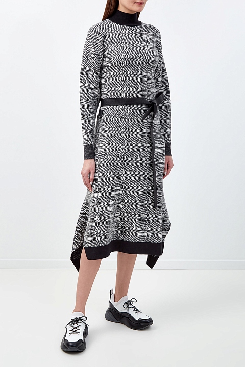 Платье-джемпер от Stella McCartney выполнено из шерстяной пряжи. Нити в монохромной черно-белой гамме образуют принт, а однотонная отделка по краям визуально структурирует силуэт. Образ в расслабленном стиле создают разрезы по бокам и контрастный по фактуре пояс из экологически чистого материала Skin Free Skin. Детали: высокий воротник, асимметричный нижний край, два кармана. Длина по спинке 112 см.