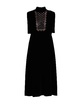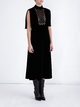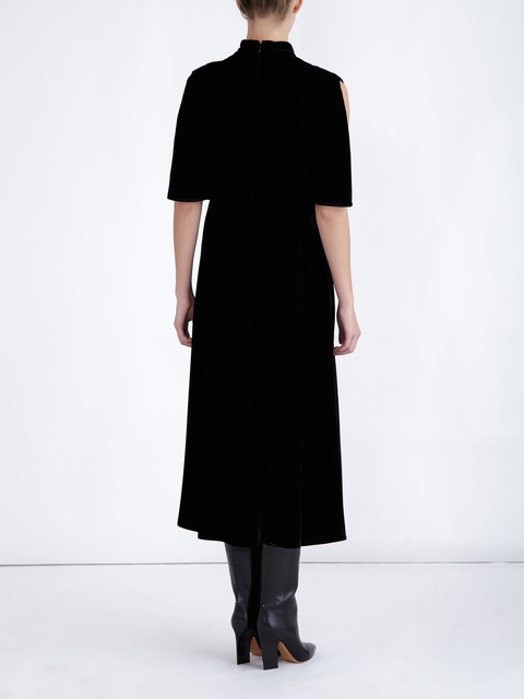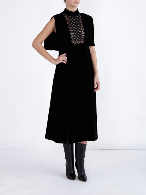 Элегантное платье миди из коллекции Valentino. Модель выполнена из лёгкой вискозы черного цвета. Лиф характеризуется мини-накидкой в тон, дополненной оригинальным геометрическим узором. Воротник-стойка. Подчёркнутая линия талии. Юбка миди А-силуэта. Сзади: застёжка-молния и маленький крючок. Сделано в Италии.