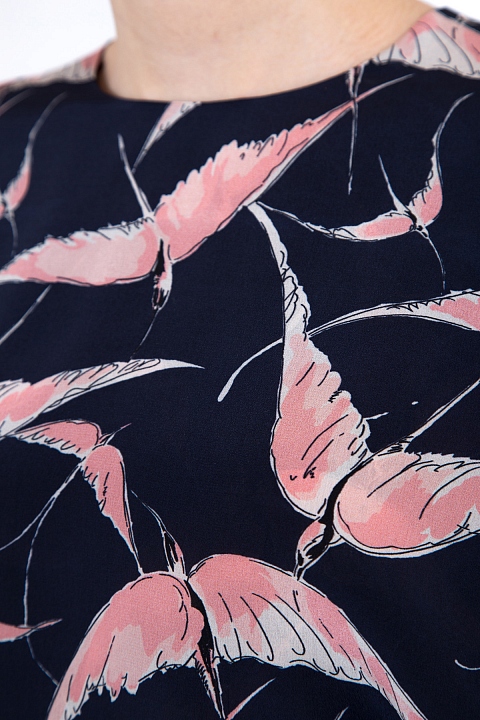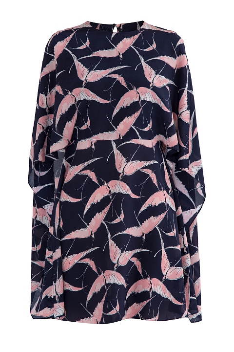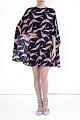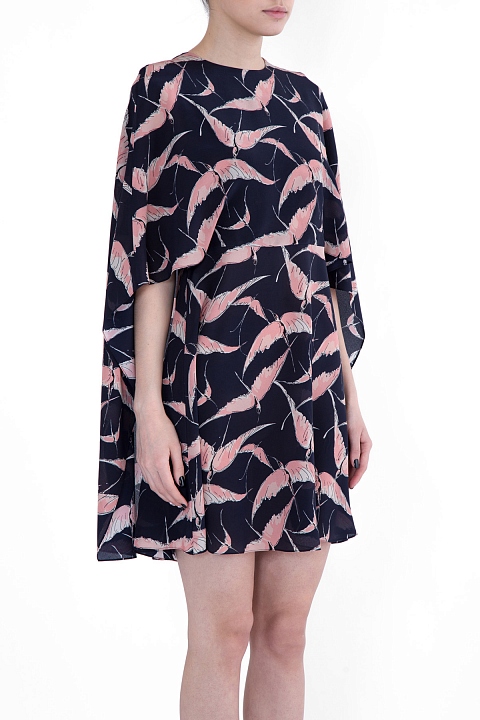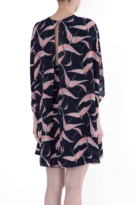 Элегантное платье-мини оригинального кроя от Valentino выполнено из шелкового крепдешина с принтом «птицы» в темно-синей и розой гамме. Модель с рукавами в стиле легкой накидки и круглым вырезом горловины. Имеются застежки-пуговицы на спинке и застежка на молнию на юбке-колоколе. Произведено в Италии.