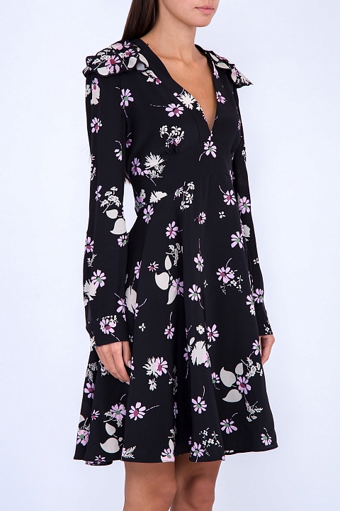 Эффектное платье Valentino приталенного кроя, выполненное из струящегося шелкового крепдешина глубокого черного цвета с фирменным принтом Flowers Fall. Модель характеризуется втачным поясом, завязывающимся на бант на спинке, объемными цветочными аппликациями на линии плеч и глубоким V-образным вырезом. Сделано в Италии.