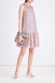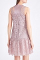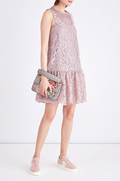 Нежное платье прямого кроя с глубоким округлым вырезом горловины и декольтированной спинкой из весенне-летней коллекции Valentino создано из воздушного цветочного кружева в холодном нежно-розовом оттенке. Особенностью модели стала подкладка из тисненой мерцающей ткани ламе с добавлением волокон люрекса серебристо-розового тона, которая создает эффект многослойности благодаря неглубокому круглому вырезу горловины и спинке с широкими проймами. Отрезной пышный подол, расположенный ниже линии талии, завершает образ в стиле спортшик. Модель застегивается на потайные молнии на спинке. Сделано в Италии.
