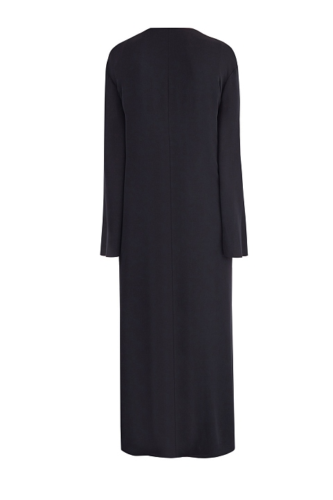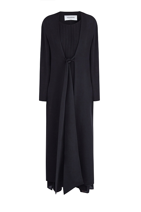 Элегантное платье от Valentino создано в ателье высокой моды из шелкового крепа в глубоком черном цвете. Благодаря особой технике обработки ткань обладает свойством восстанавливать форму после воздействия влаги. Модель дополнена верхним слоем-кейпом, стилизованным под изысканную накидку. Внутренняя часть с круглой проймой горловины выполнена из плиссированного шелка, двухслойный подол формирует асимметричный нижний край. сделано в Италии.