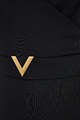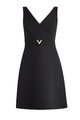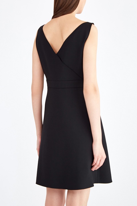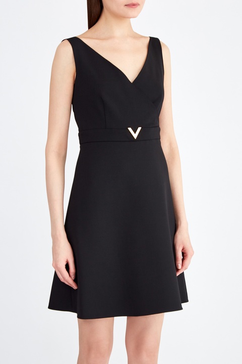 Элегантное платье от Valentino выполнено из шерстяной ткани Double Comfort Crepe в черном цвете, синтетические волокна в составе придают материалу эластичность и гибкость. Лиф кроя на запах дополнен втачным поясом на завышенной линии талии с литым золотистым символом «V». Детали: широкие бретели, расклешенный подол длины мини, модель без застежки. Сделано в Италии.