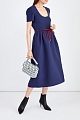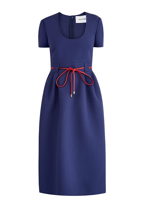 Эффектное платье в стиле бонтон от Valentino выполнено из соединенной вручную двухслойной шерстяной ткани. Элегантный образ создает пышный подол с защипами и овальный вырез декольте. Модель с короткими рукавами дополнена потайной застежкой-молнией, а также двумя прорезными карманами. Кожаный пояс фирменного алого цвета завершает дизайн. Сделано в Италии.