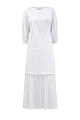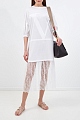 Оригинальное платье-миди от Valentino выполнено из мягкого хлопкового джерси в белом цвете. Лиф-футболка с короткими рукавами контрастирует с воздушным подолом из полупрозрачного кружева в тон. Изделие дополнено оборками и драпировками, которые придают образу женственность. Детали: пышные рукава, логотип VLOGO в технике аппликации, спущенная линия плеч. Сделано в Италии.