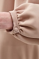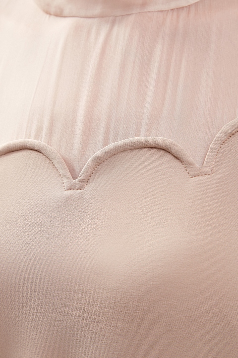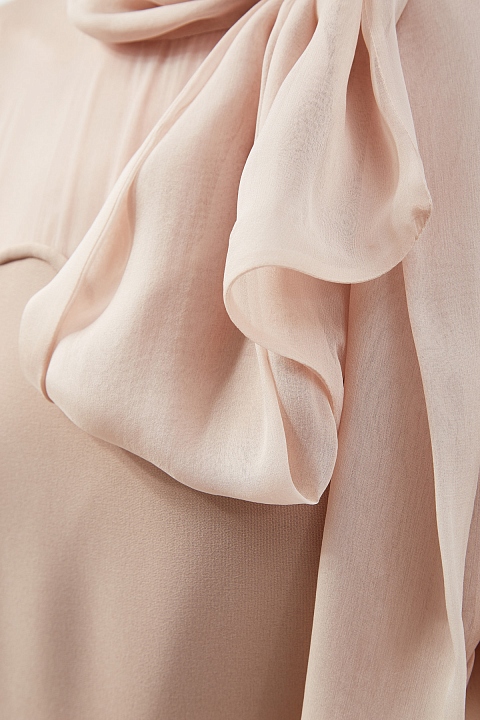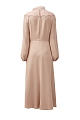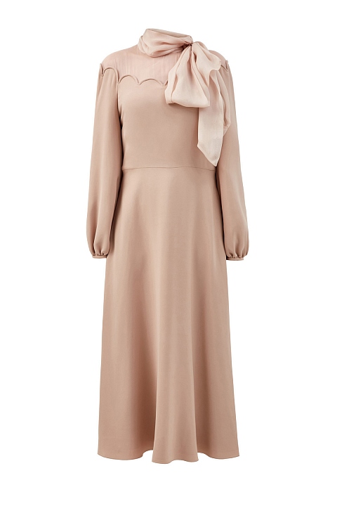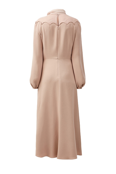 Элегантное платье от Valentino полностью создано из плотного шелка — за счет своей структуры ткань хорошо сохраняет форму и образует объемные драпировки. Особенностью модели стал ворот-стойка, продолженный лентами, и вставка из вуали на лифе с фестончатой отделкой края. Знаковый для бренда А-силуэт дополнен объемными рукавами. Детали: полностью на подкладке, пуговицы обтянуты тканью в тон. Сделано в Италии.