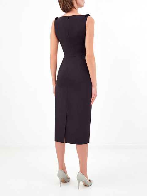 Минималистичное платье-футляр из коллекции от Valentino. Для создания модели была выбрана ткань Cady Evolution — гладкий, держащий форму материал акцентирует внимание на строгих линиях кроя. Широкий овальный вырез придает образу настроение в духе аристократизма, а бретели дополнены культовыми бантами. Приталенный крой с вытачками дополнен подкладкой для посадки точно по фигуре и застежкой на потайную молнию. Детали: шлица на спинке для комфорта в движении, длина миди. Сделано в Италии.