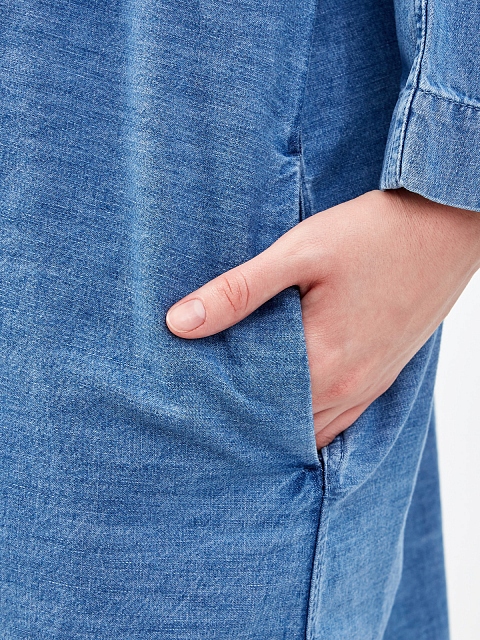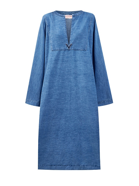 Стильное платье-миди от Valentino выполнено из денима Chambray — легкой и дышащей хлопковой ткани, универсальной для летнего сезона. Расслабленный крой с мягкой линией плеч и свободным силуэтом дополнен эффектной деталью — V-образным вырезом с литым логотипом. Сделано в Италии.