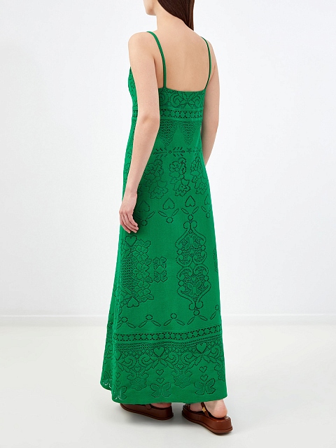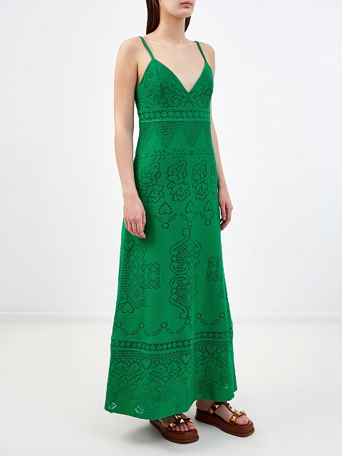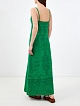 Эффектное платье-макси из круизной коллекции от Valentino создано в насыщенном изумрудном оттенке. Модель ручной работы дополнена узором Peonies Blanket с флористическим мотивом. Детали: низкий V-образный вырез, узкие бретели. Сделано в Италии.