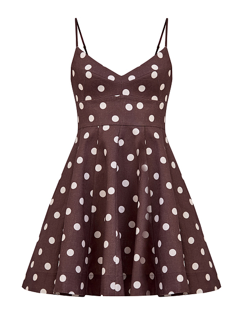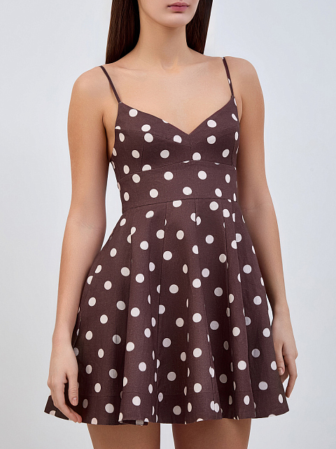Короткое платье-сарафан с игривым настроением от Zimmermann. Для создания модели была выбрана дышащая льняная ткань — идеальное решение для летнего сезона. Изделие с принтом в «горох», приталенным бюстье и тонкими регулируемыми бретелями. Детали: V-образный вырез, прорезные карманы, застежка на молнию и эластичная вставка на спинке.