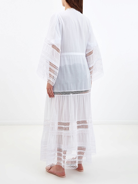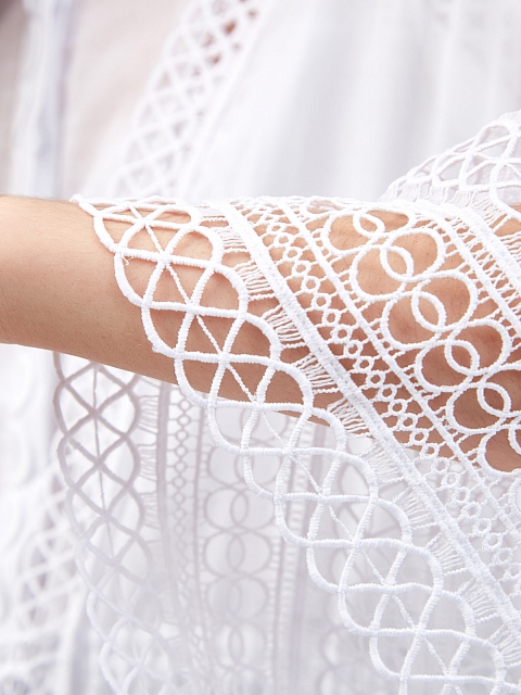 Удлиненная туника из круизной коллекции от Charo Ruiz Ibiza создана из тонкого полупрозрачного хлопка в белоснежном оттенке. Ажурная гипюровая вышивка делает модель идеальной для составления расслабленных многослойных образов. Пояс и рукава изделия дополнены регулируемой кулиской, что позволяет индивидуально моделировать силуэт.