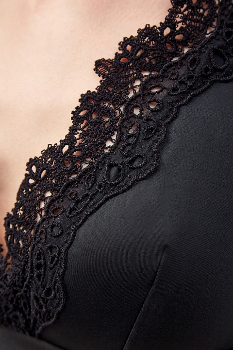 Лиф-бикини из коллекции Beachwear от Ermanno Scervino выполнен из быстросохнущей эластичной ткани в черном цвете. Модель без чашечек слегка моделирует силуэт. V-образный вырез подчеркивает кружево ручной работы. Детали: регулируемые бретели, широкий поддерживающий пояс по нижнему краю, металлическая застежка. Сделано в Италии.