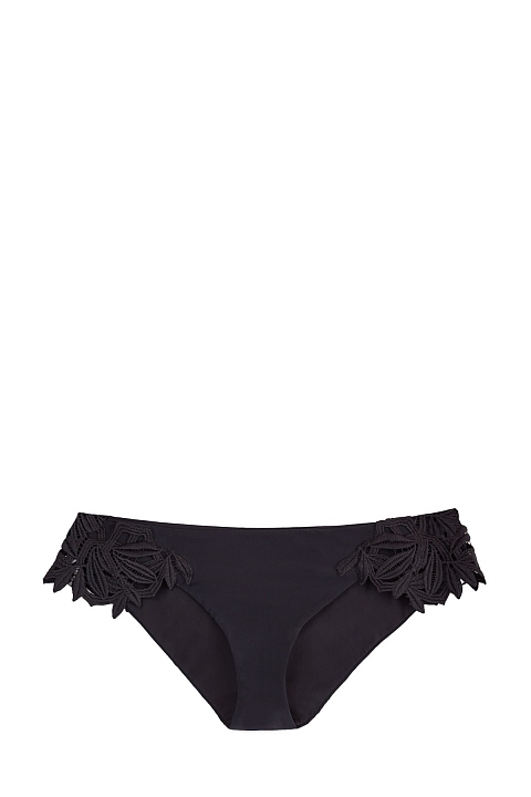 Женские бикини-слипы бренда Ermanno Scervino с заниженной посадкой на бедрах. Модель создана из эластичной быстросохнущей ткани в глубоком черном цвете и украшена изящным кружевом с цветочными мотивами на боковых панелях. Сделано в Италии.