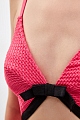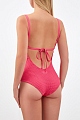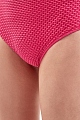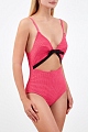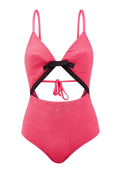 Эффектный слитный купальник от Fisico выполнен в ярком розовом цвете. Для создания модели был выбран трикотаж на основе микрофибры — быстросохнущего материала, стойкого к хлору и выцветанию. Фактурный узор в технике плетения и прострочка серебристой нитью с металлическим блеском придают образу оригинальный акцент. Контрастная вставка из репсовой ленты в черном цвете и декоративный бант завершают дизайн. Детали: вырезы на передней планке и спинке, эластичные завязки-ленты.