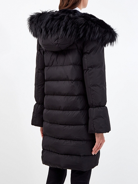 Удлиненный пуховик от ADD создан в черном цвете с гладкой передней поверхностью и стеганой — задней. Водонепроницаемый нейлон и набивка из утиного пуха и пера адаптируют модель к любым погодным условиям, а ворот из густого меха енота в тон дополнительно защищает от ветра. Динамичный штрих — объемные прорезные карманы на передней планке и внутренняя кулиска на манжетах. Детали: двойная линия застежки, отделка из меха кролика.