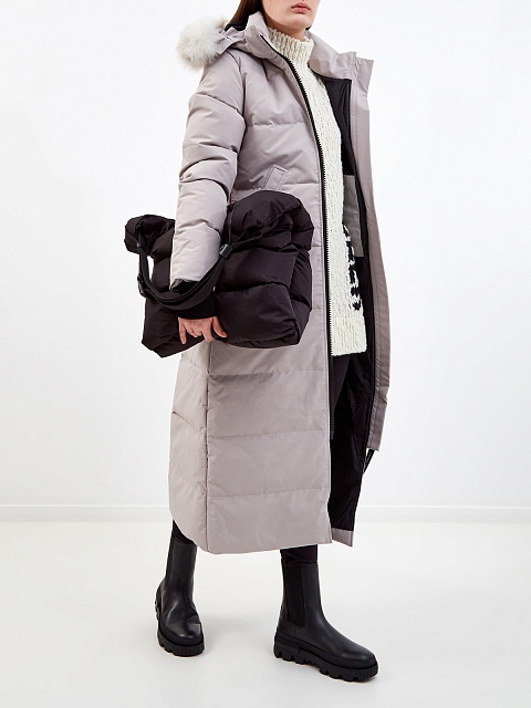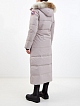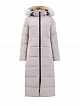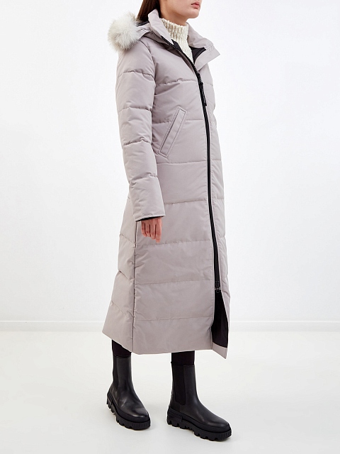 Удлиненный стеганый пуховик с отделкой из меха койота