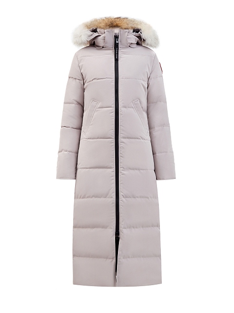 Длинный пуховик от Canada Goose выполнен из технологичной водонепроницаемой ткани Arctic-Tech в серо-бежевом оттенке. Модель утеплена слоем воздушного пуха, продуманный до мелочей дизайн обеспечивает надежную защиту от ветра благодаря формующей вставке на капюшоне и потайным эластичным манжетам. Детали: два внешних и два внутренних кармана, мех койота, съемный капюшон. Сделано в Канаде.