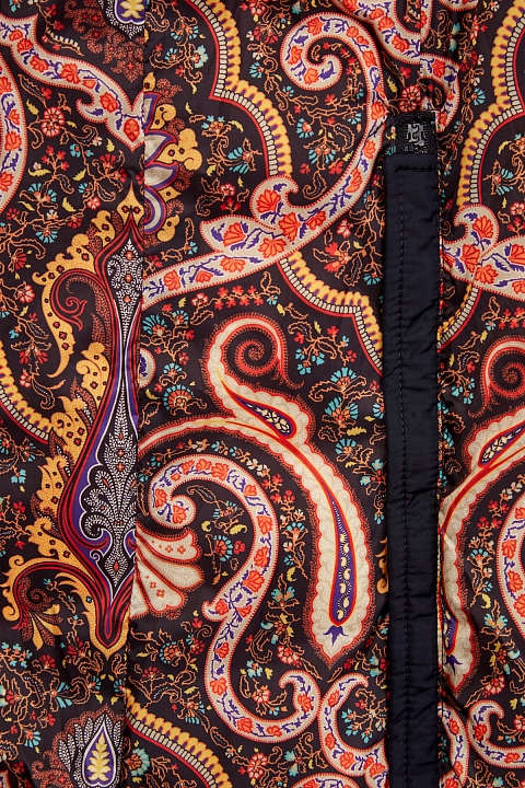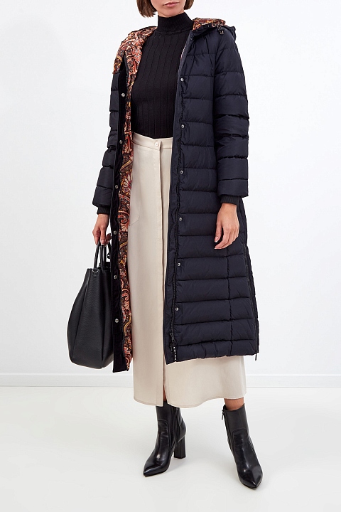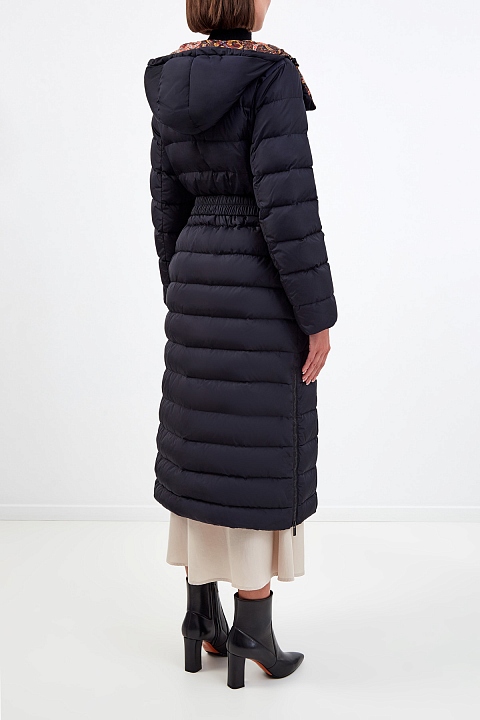 Удлиненный пуховик от Etro выполнен из легкого и прочного нейлона. Утеплитель из пуха и пера сохраняет комфорт даже в условиях низких температур. Базовый черный цвет дополнен контрастной внутренней отделкой с принтом пейсли. Универсальный крой предусматривает молнии по бокам, съемный пояс и кулиску на капюшоне для индивидуальной подгонки силуэта. Детали: матовая фурнитура, прорезные карманы, двойная застежка. Сделано в Италии.