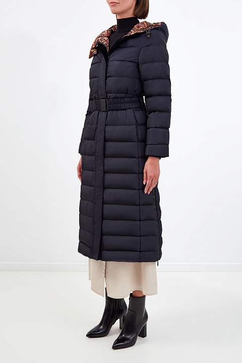 Пуховик со съемным поясом и контрастной подкладкой