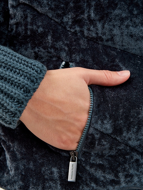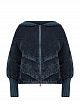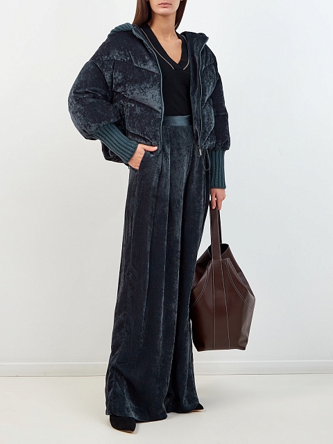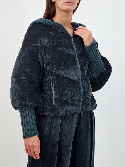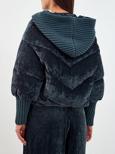 Укороченный пуховик из велюра с вязаными манжетами и капюшоном