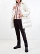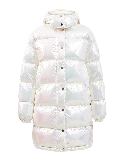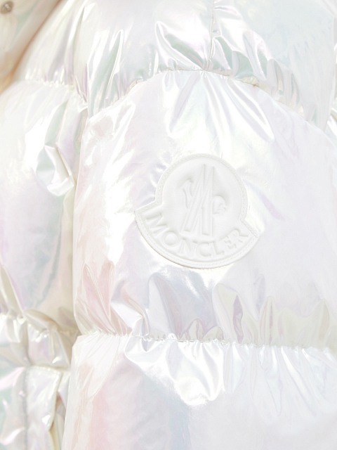 Стильный женский пуховик от Moncler выполнен из глянцевого нейлона в перламутрово-белом оттенке. Водонепроницаемая ткань и пуховый утеплитель делают модель особенно актуальной для зимнего сезона. Практичный дизайн со съемным капюшоном и эластичными манжетами обеспечивает комфортную посадку. Детали: двойная линия застежки на молнию и кнопки, два кармана, логотип бренда в тон изделия.