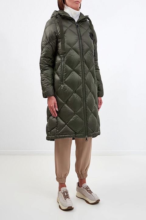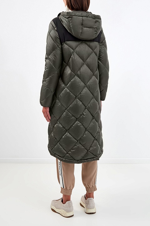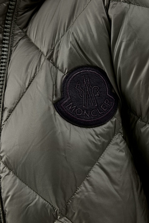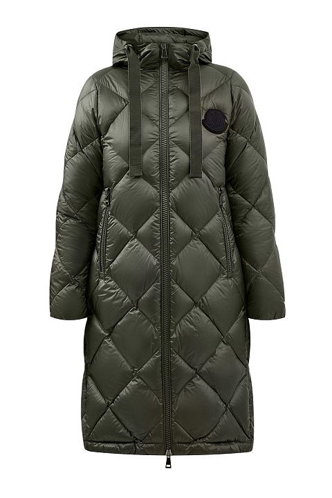 Удлиненный пуховик Duroc от Moncler выполнен в оттенке хаки из фирменного нейлона Longue Saison. Ромбический стеганый узор и вставка из матовой ткани на спинке вносят в образ динамичный штрих. Невесомый и теплый наполнитель из пуха и пера делает модель актуальной как в межсезонье, так и для холодных дней, а универсальная длина позволяет интегрировать изделие в любой повседневный образ. Детали: молния с двойным пуллером, два кармана, несъемный капюшон.