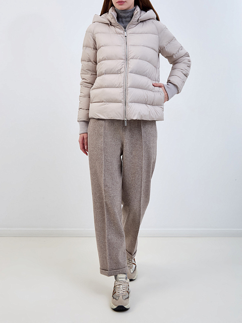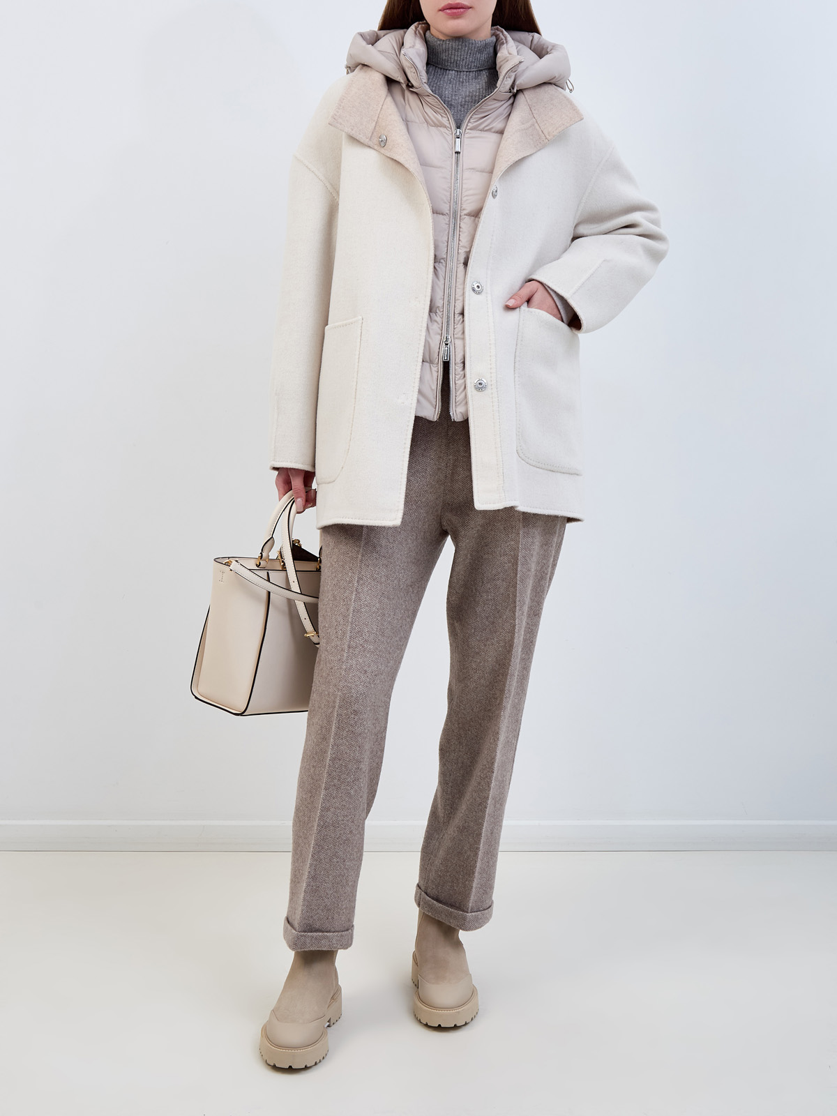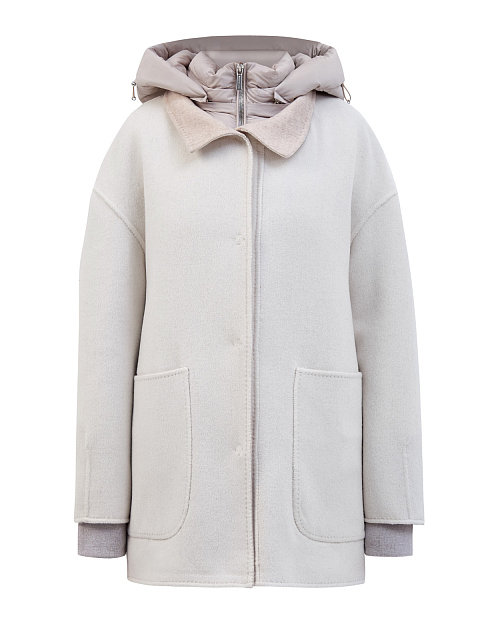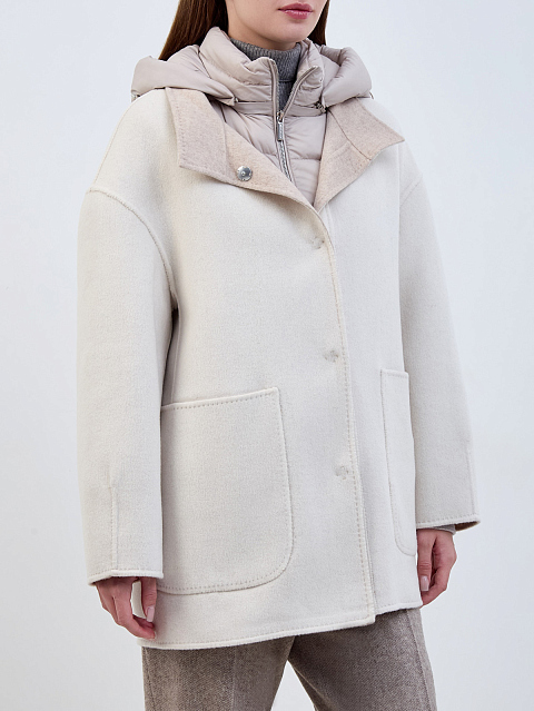 Женский пуховик-трансформер Natisha от Moorer станет незаменимым элементом гардероба в холодное время года. Функциональная модель сочетает пуховую стеганую куртку из влагозащитного нейлона и двустороннее верхнее пальто в молочном и бежевом оттенках. Съемный капюшон на молнии и эластичные манжеты надежно защищают от ветра. Детали: застежка куртки на молнию с двойным пуллером, застежка пальто на кнопки, накладные и прорезные карманы.
