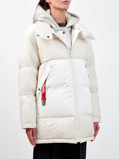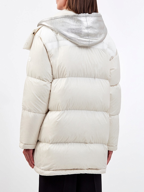 Эффектный пуховик из коллекции Army от Yves Salomon выполнен в белом цвете. Водонепроницаемый нейлон и утеплитель из пуха и пера адаптируют модель к любым погодным условиям, внутренний жилет в серебристом оттенке с отделкой из меха ягненка дополнительно защищает от ветра. Объемные карманы и контрастный карабин подчеркивают динамичный стиль изделия. Детали: съемный капюшон, двойная линия застежки на молнию и кнопки. Сделано во Франции.